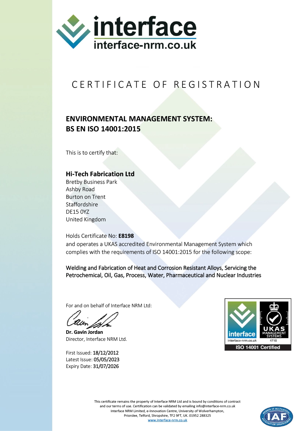 Hi-Tech Fabrication Ltd ISO14001 Certificate E8198 (ID 22802)
