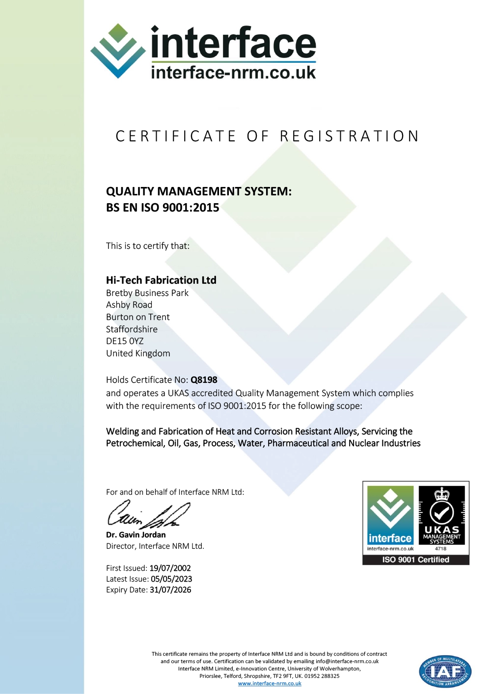 Hi-Tech Fabrication Ltd ISO9001 Certificate Q8198 (ID 22801)